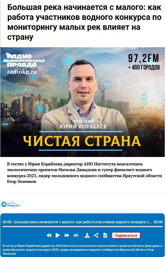 13 июля в эфире радио «Комсомольская правда» вышла программа «Чистая страна» с участием директора Института консалтинга, руководителя Российского открытого молодежного водного конкурса Н.Г. Давыдовой и суперфиналиста Конкурса 2023 года, лидера Молодежного водного сообщества Иркутской области Егора Зеленкова. Говорили о молодежных водных сообществах, которые работают в России с 2022 года.
