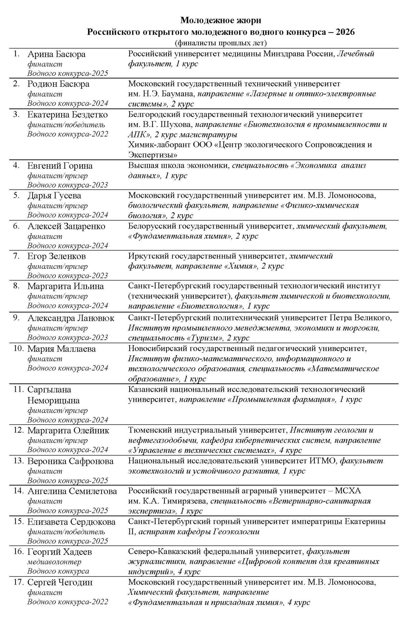 Сформировано молодежное жюри Российского открытого молодёжного водного конкурса-2026, в которое вошли 17 финалистов прошлых лет.
