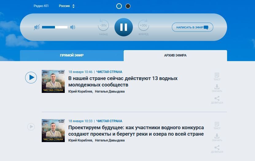 18 января в эфир радиостанции "Комсомольская правда" вышла программа "Чистая страна" с участием руководителя Водного конкурса Н.Г. Давыдовой, финалистов Водного конкурса, членов и координаторов молодежных водных сообществ.